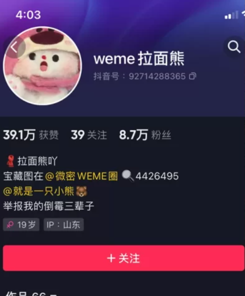 拉面熊微密圈,这个身材真是不得了,人称童颜巨熊,日常在抖音发布穿搭作品,吸引了不少粉丝。