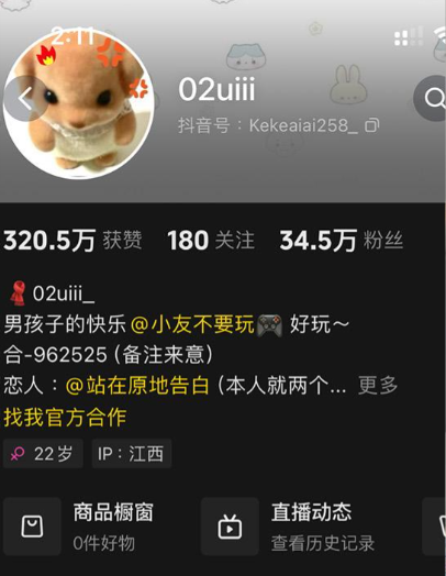 来自江西的「02uiii」(抖音号:Kekeaiai258_)最近势头挺猛。这位新锐创作者虽然还没把商品橱窗打开,一心扑在内容上,但数据已经相当亮眼:34.5万粉丝,累计获赞320.5万次。如果你是个喜欢琢磨青年文化的“Z世代”,那他的账号绝对值得你逛一逛。
